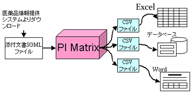 特徴医薬品情報提供システムで提供されている添付文書SGMLファイルを早く簡単にCSVファイルに変換できます。 変換したい項目と並び順を指定して変換することができます。頻繁に改訂される添付文書情報の加工を手作業で行うのは大変な労力が必要です。 もともと内容を利用するためにSGML形式で提供されている添付文書情報ですから,簡単に利用できるツールが求められます。 しかも頻繁な改訂が行われている現状では,手作業ではとても追いつきません。 PI Matrixなら,必要な項目を指定の順番で,誰でも簡単にCSVファイルに変換し,エクセルなどで読み込んで加工できるようになります。 100品目のSGMLデータの変換が14秒〜15秒程度*と,手作業で入力・作成していたのでは何時間もかかる作業がPI Matrixならほんの少しの時間で終わってしまいます。 ですから,PI Matrixを使えば,院内医薬品情報データベースの入力用情報に,あるいは院内医薬品集の制作データにと,最新の情報を簡単に利用できるようになります。 また,製薬企業の皆様は,自社製品の最新情報一覧や他社製品との比較表などの社内資料を必要に応じて容易に作成することができるようになります。